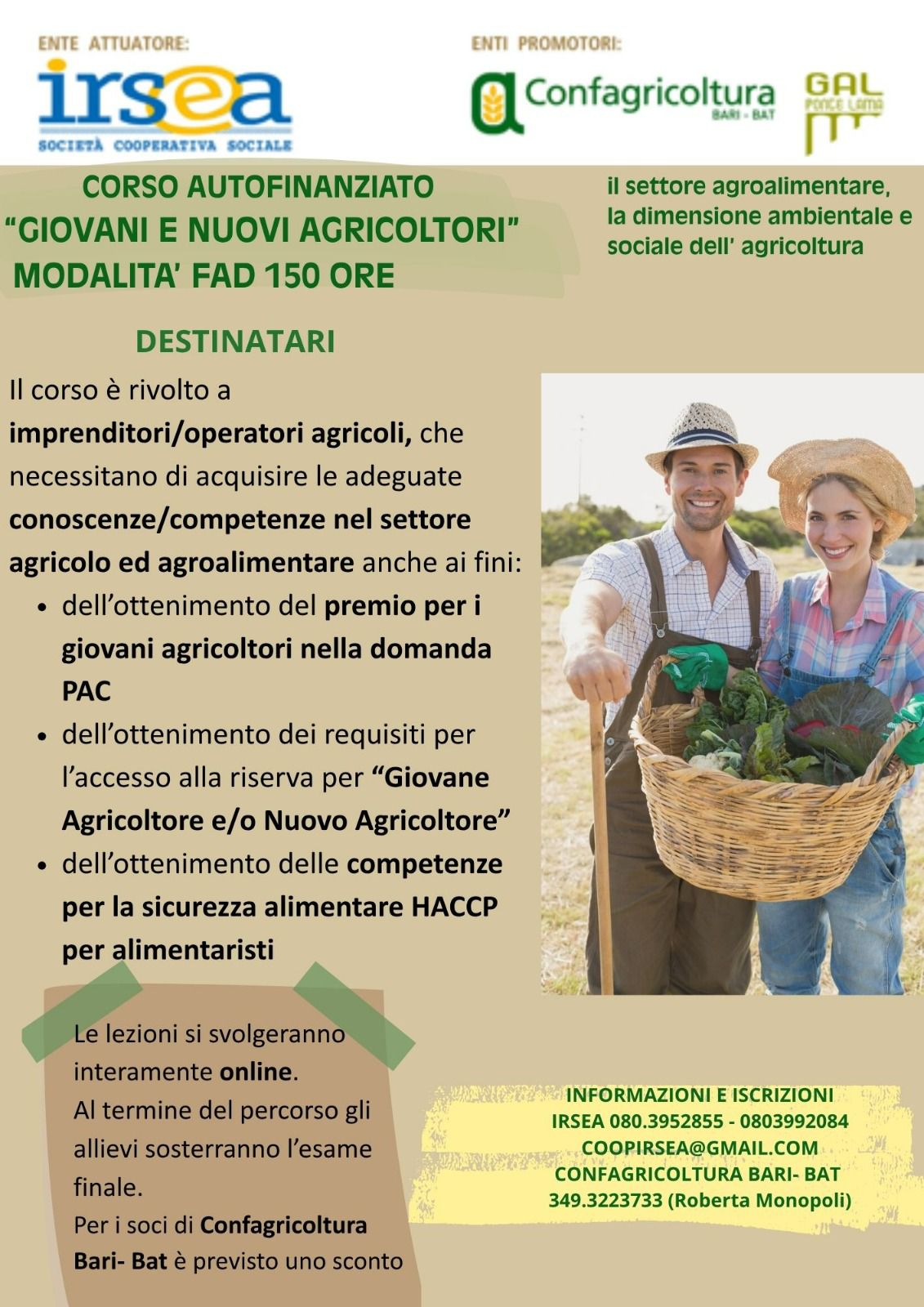 L’attività è organizzata in collaborazione con Confagricoltura Bari-Bat e con il GAL Ponte Lama per i cui soci è previsto uno sconto.