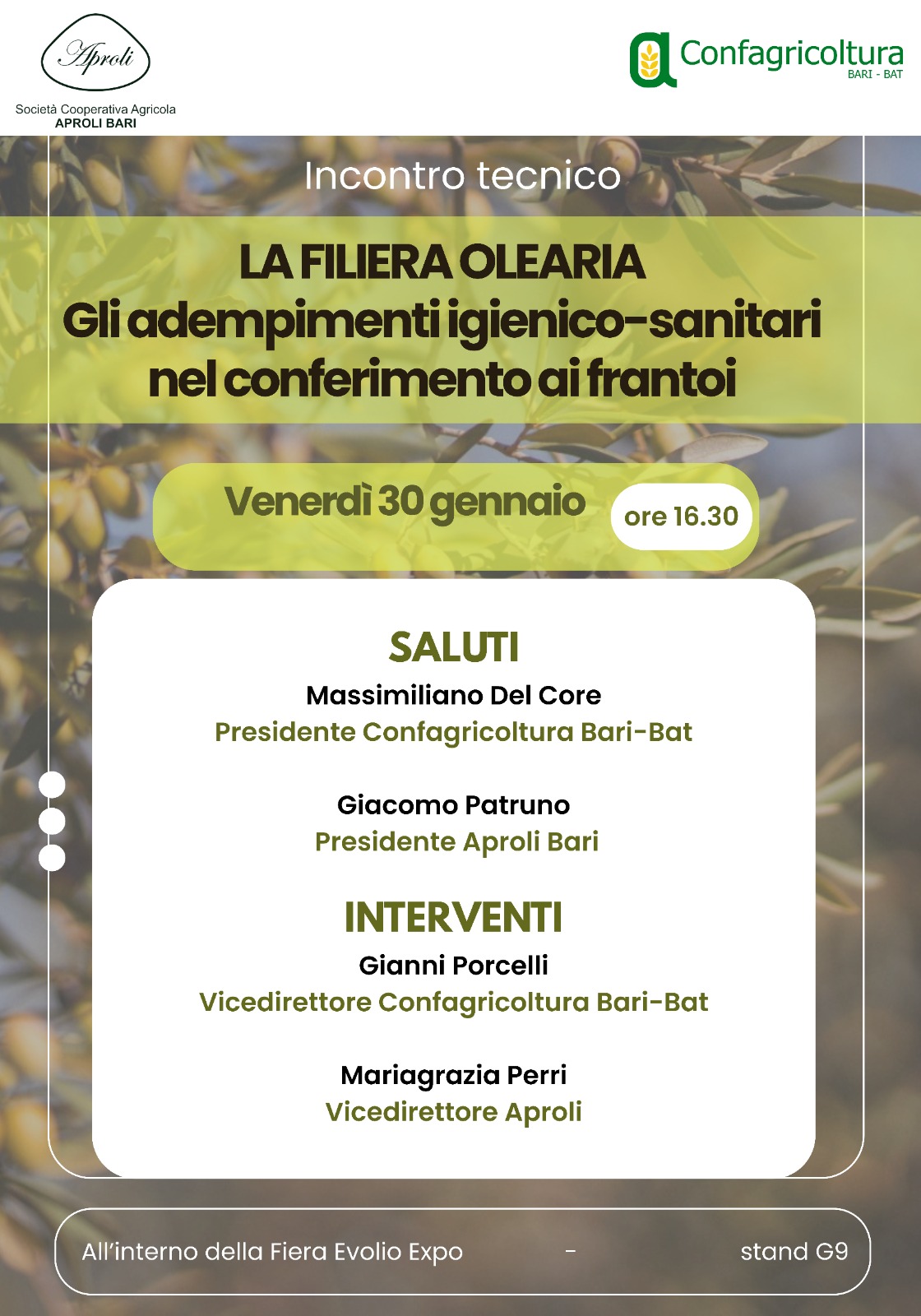 In occasione della seconda edizione di Evolio Expo, Confagricoltura Bari-Bat e Aproli, vi invitano a partecipare a un incontro tecnico dedicato a uno dei temi più complessi per il settore olivicolo-oleario: la corretta gestione degli adempimenti igienico-sanitari nel conferimento delle olive ai frantoi.
