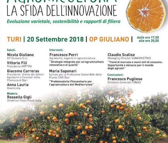 L’associazione regionale pugliese dei tecnici e ricercatori in agricoltura (Arptra) organizza con l’Ordine dei dottori agronomi e dei dottori forestali della provincia di Bari e Fruit Journal, l’incontro “Agrumicoltura, la sfida dell’innovazione”.
