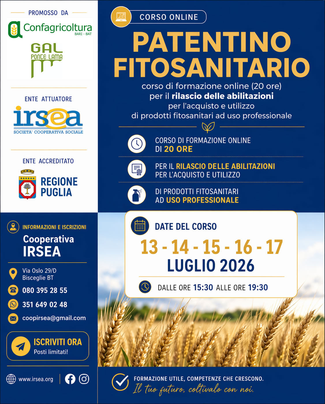 Sono ufficialmente aperte le iscrizioni al corso di formazione online che partirà a luglio, finalizzato al rilascio del “Patentino Fitosanitario”, necessario per acquistare e impiegare prodotti fitosanitari classificati come tossici, molto tossici e nocivi, in attuazione del D.M 22/01/2014 e DGR della Regione Puglia n.627/anno 2015.