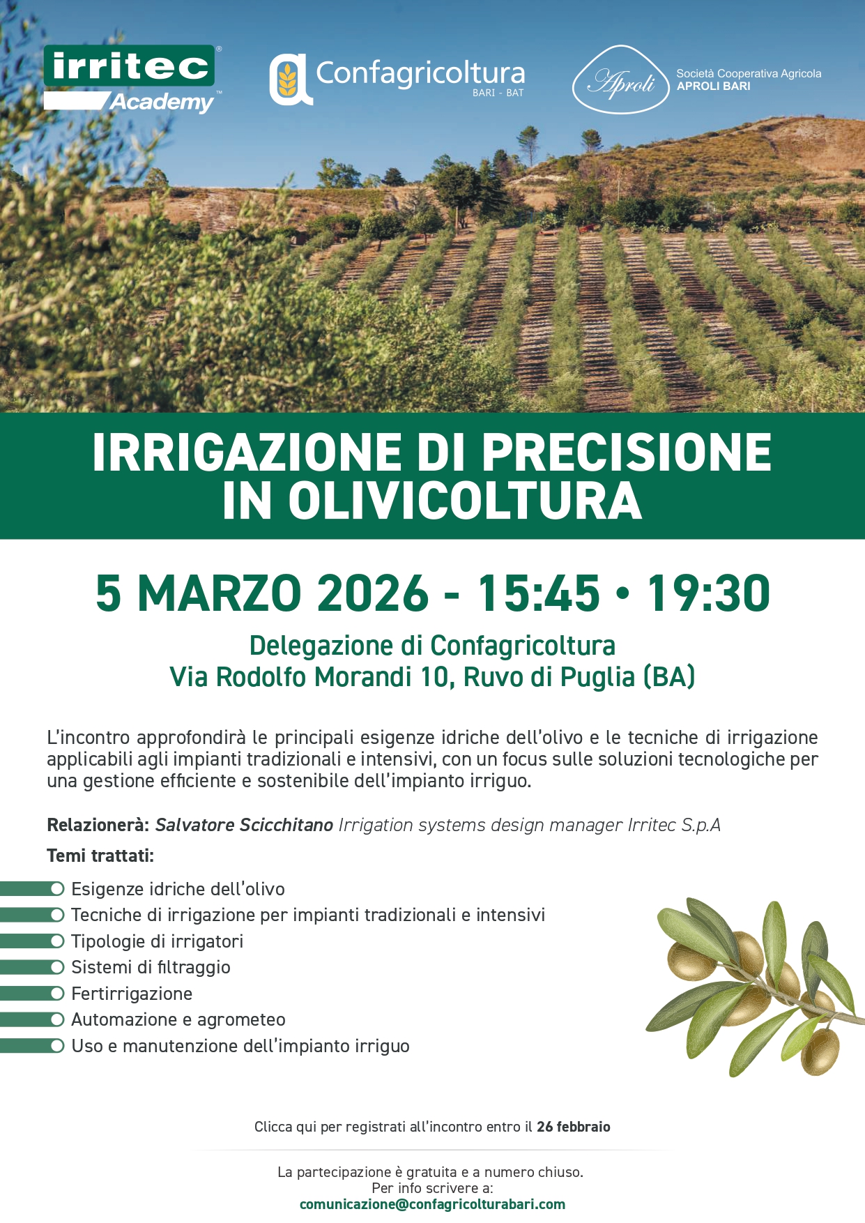 L’incontro si terrà giovedì 5 marzo alle ore 15.45 presso la ns sede di Confagricoltura Ruvo (in Via Rodolfo Morandi, 10) e approfondirà le principali esigenze idriche dell’olivo e le tecniche di irrigazione applicabili agli impianti tradizionali e intensivi, con un focus sulle soluzioni tecnologiche per una gestione efficiente e sostenibile.
