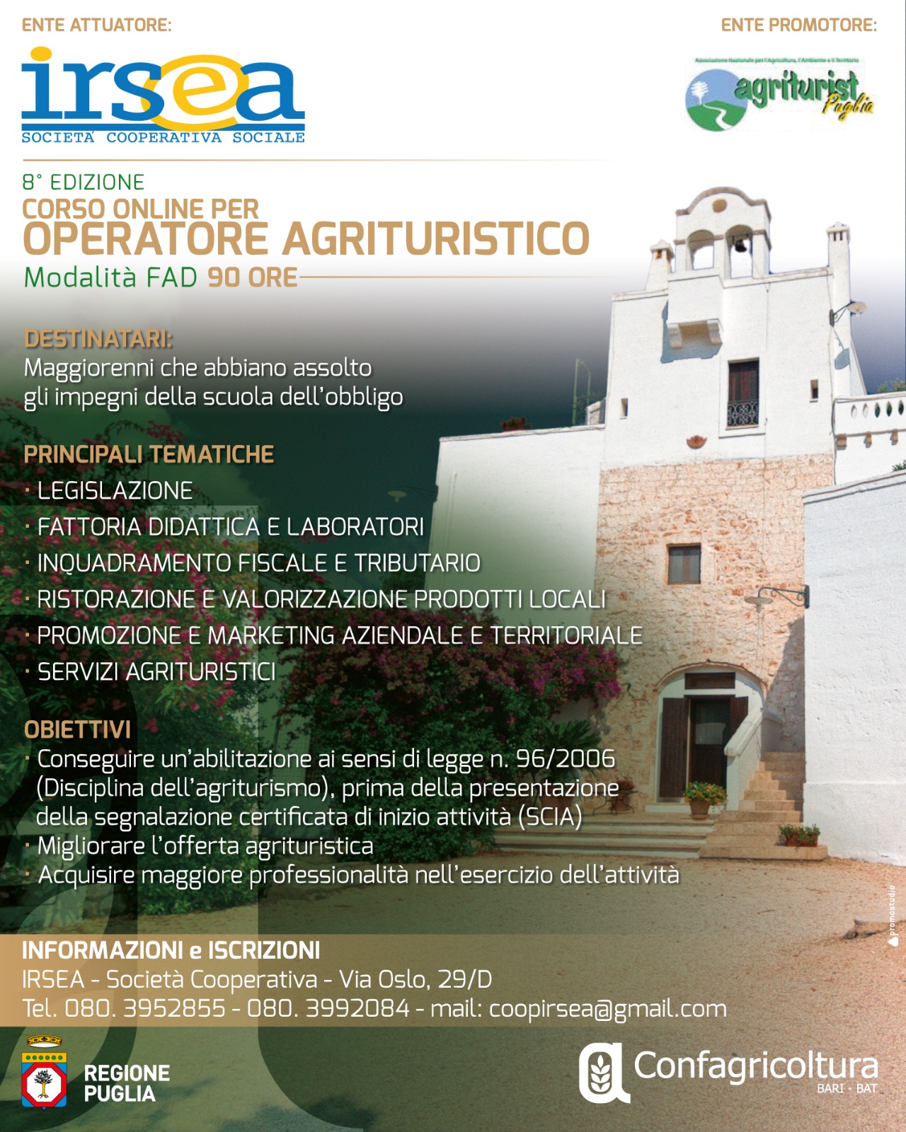 È IRSEA ad attuare questa attività formativa, in collaborazione con Agriturist Puglia e Confagricoltura Bari-Bat, per rispondere alle numerose richieste dei nostri associati. Il corso di formazione si concentrerà su tematiche necessarie per qualificare un operatore agrituristico: legislazione e normativa, fattoria didattica e laboratori, inquadramento fiscale e tributario, ristorazione e valorizzazione prodotti locali, promozione e marketing aziendale e territoriale, servizi agrituristici.