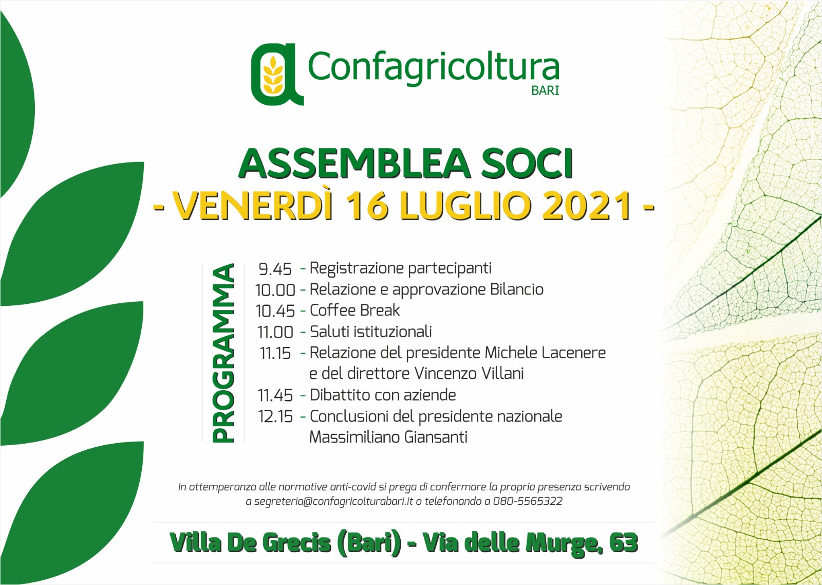 Venerdì 16 luglio a Bari, dalle ore 9,45 in Villa de Grecis, via Delle Murge 63, si terrà l’assemblea annuale di Confagricoltura Bari-Bat. Per l’importate occasione, sarà presente il presidente nazionale di Confagricoltura, Massimiliano Giansanti, al quale saranno affidate le conclusioni dei lavori dell’Assemblea.