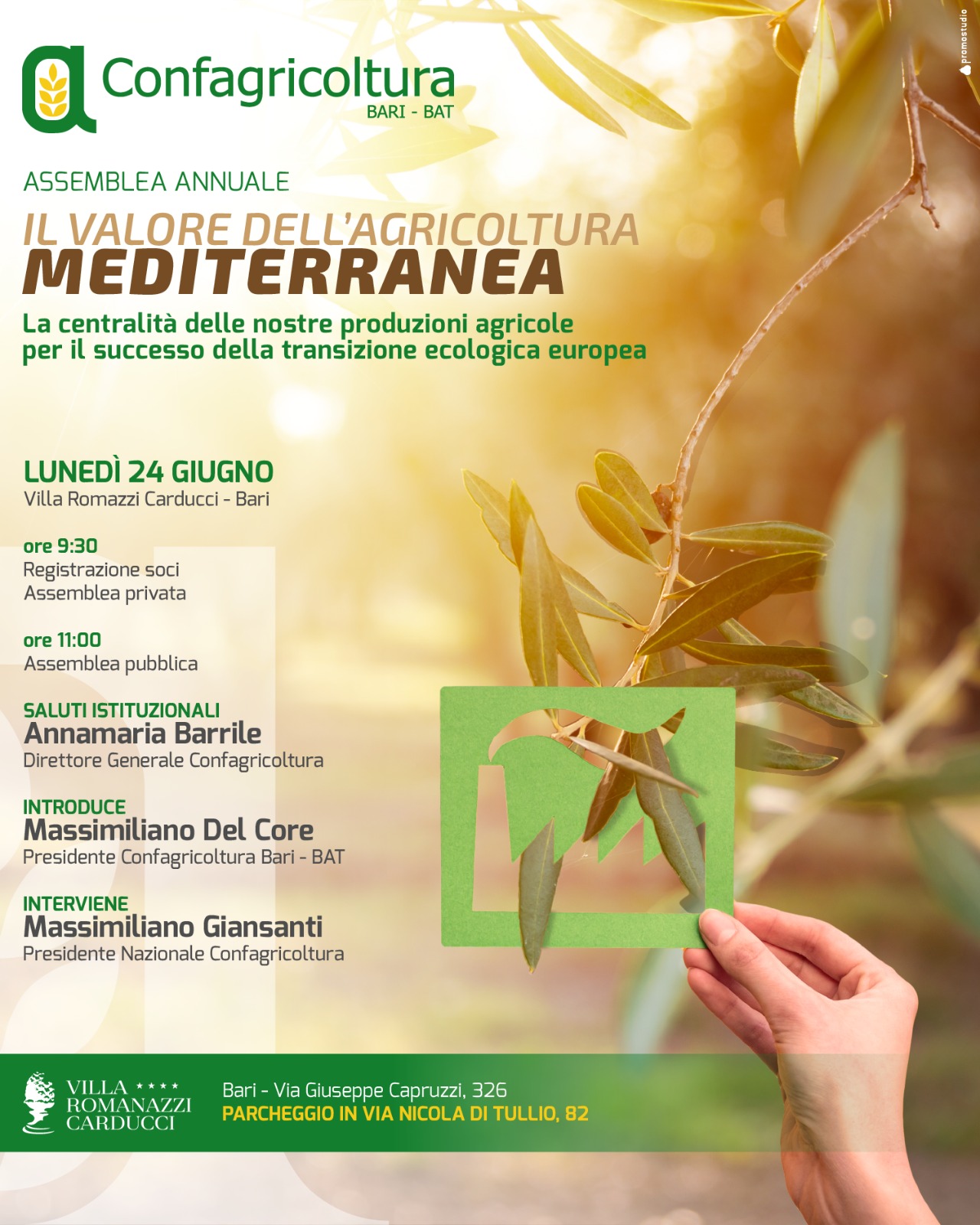 L’evento, intitolato “Il valore dell’agricoltura Mediterranea”, si terrà lunedì 24 giugno 2024 alle ore 11:00 presso Villa Romanazzi Carducci (Via Giuseppe Capruzzi, 326) a Bari e vedrà la partecipazione di Massimiliano Giansanti, presidente Confagricoltura, e Annamaria Barrile, direttore generale Confagricoltura.