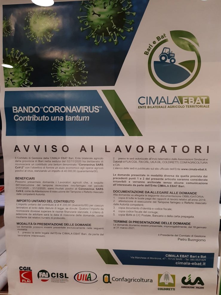 Il Comitato di gestione della CIMALA EBAT Bari ha deliberato di riconoscere un contributo una tantum, denominato “Coronavirus Sars Cov-2”, per fornire un aiuto economico agli operai agricoli positivi al virus. La cifra stanziata è di 40mila euro e il contributo è di 200 euro a lavoratore.