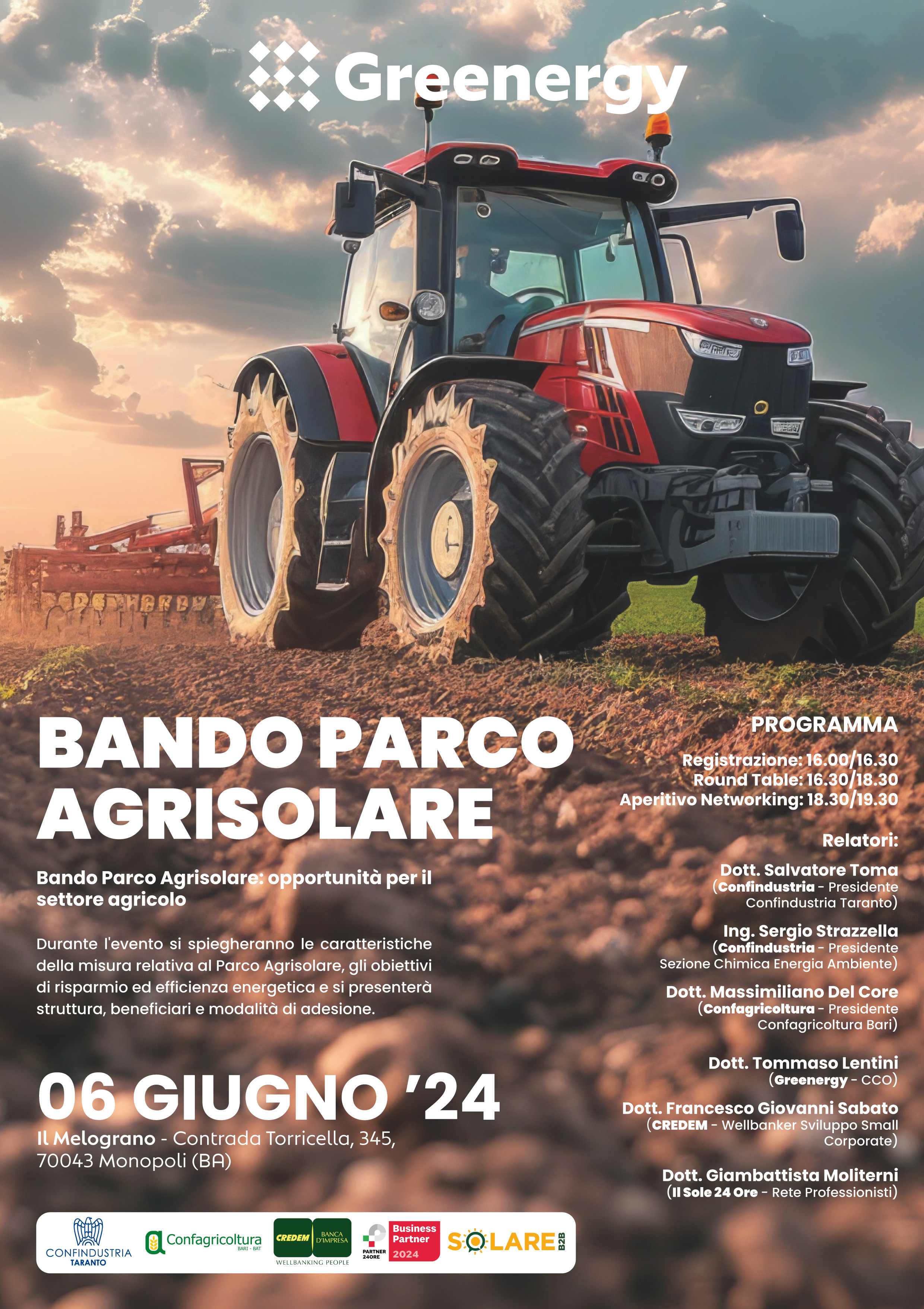 Saranno questi i temi che si affronteranno il 6 giugno presso Il Melograno a Monopoli e la Greenergy, lo farà con il contributo di un referente di Confindustria, del Presidente di Confagricoltura Bari-Bat Dott. Del Core, Dott. Francesco Sabato per conto di Credem banca d’Impresa. Ad aprire l’evento due testimonianze di aziende che hanno beneficiato del bando negli scorsi anni grazie a Greenergy mentre a chiudere ci sarà l’azienda stessa con le parole del Dott. Tommaso Lentini COO Greenergy. Media partner dell’evento Solare B2B che darà la possibilità ai partecipanti di compilare un form per ricevere gratuitamente la rivista e la newsletter e Business Partner 24 del Sole24Ore.