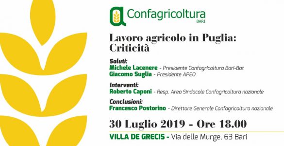“Lavoro agricolo in Puglia: criticità”, è il titolo dell’incontro organizzato da Confagricoltura Bari-Bat e riservato ai soci, l’appuntamento è per domani 30 luglio, alle ore 18, in Villa De Grecis...