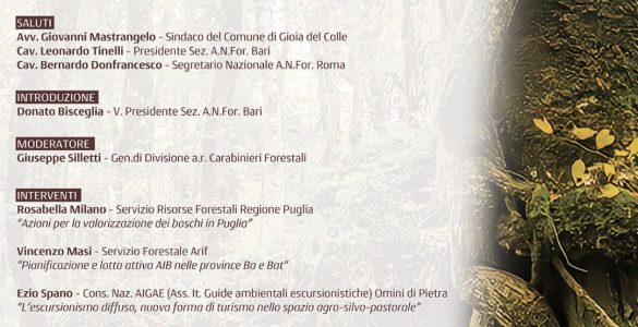 Si svolgerà giovedì 16 giugno a partire dalle ore 17, a Gioia del Colle, nella sala De Deo di Palazzo di città, la Tavola rotonda per l’aggiornamento tecnico-culturale dei soci dell’Associazione nazionale forestale A.N...