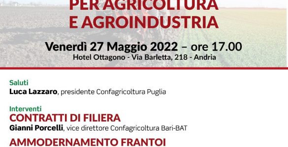 Si terrà venerdì 27 maggio, ad Andria, a partire dalle ore 17 nell’hotel Ottagono, in via Barletta 218, il convegno organizzato da Confagricoltura Bari-Bat su “I contributi del Pnrr per agricoltura e...