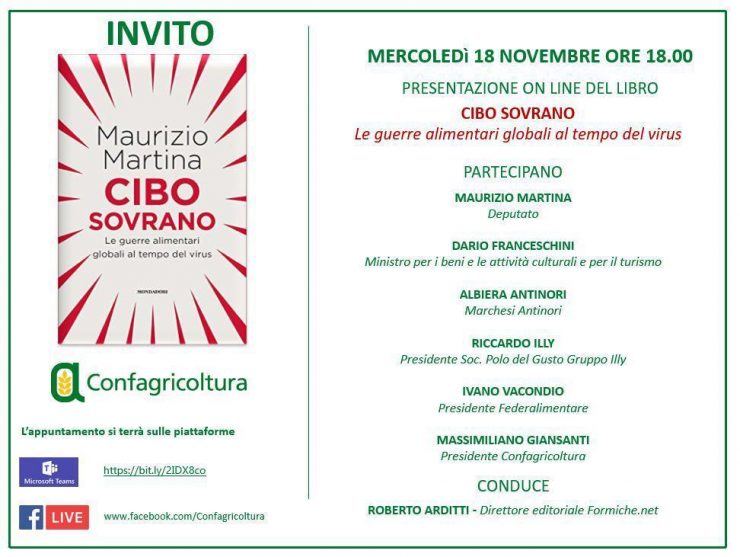 Confagricoltura, per l’appuntamento online previsto per mercoledì 18 novembre alle ore 18, ha organizzato un parterre di personalità di spicco del mondo imprenditoriale, politico e associativo italiano, per un dibattito che, prendendo spunto dall’opera di Martina, affronterà temi di attualità relativi alle produzioni agricole e agroalimentari, alle relazioni commerciali internazionali e agli equilibri di mercato, in una fase particolarmente difficile per l’Italia, l’Europa e il mondo intero.