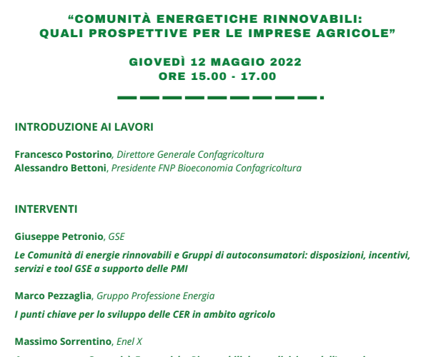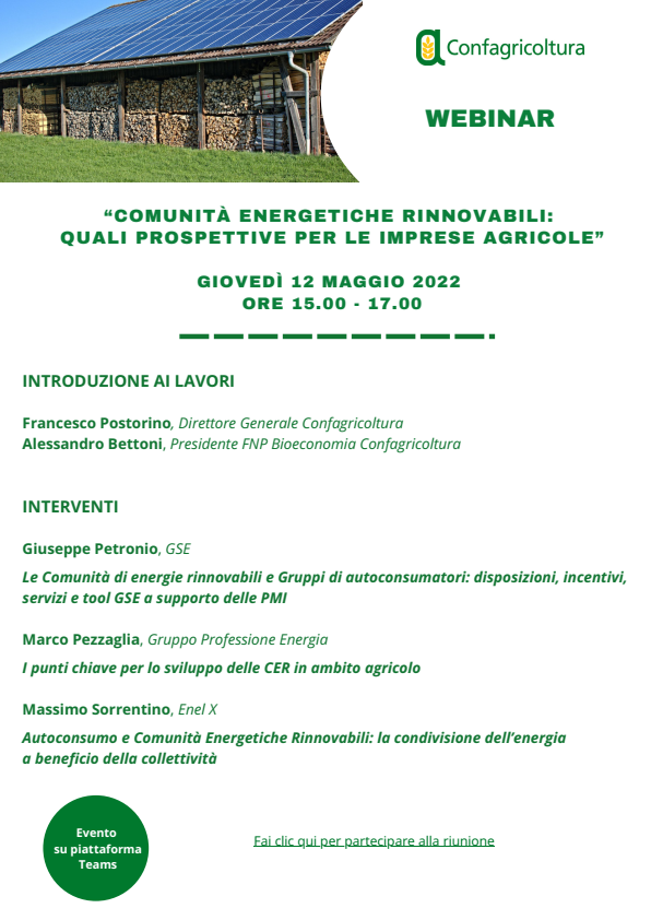 Il 12 maggio Confragricoltura organizza un webinar dedicato al territorio per fornire le prime informazioni sulle Comunità di energie rinnovabili. Il webinar si terrà su piattaforma Teams.