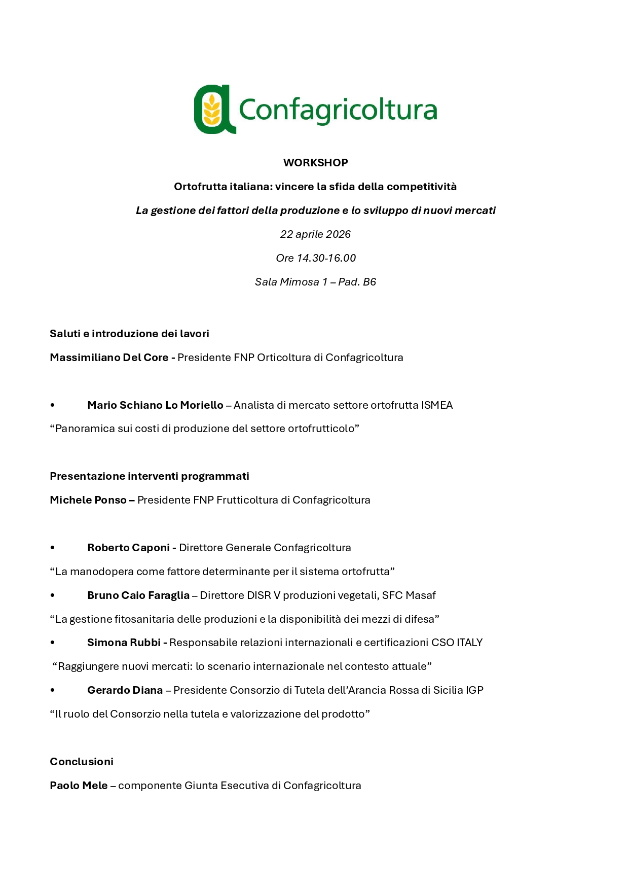 Tra i momenti di approfondimento è previsto mercoledì 22 aprile alle 14.30, presso la sala Mimosa 1 – Pad. B6, il workshop dal titolo “Ortofrutta italiana: vincere la sfida della competitività”.