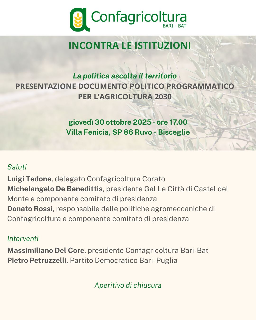 Giovedì 30 ottobre alle ore 17.00, presso Villa Fenicia a Ruvo, si terrà un incontro dedicato alla presentazione del Documento Politico Programmatico per l’Agricoltura 2030.