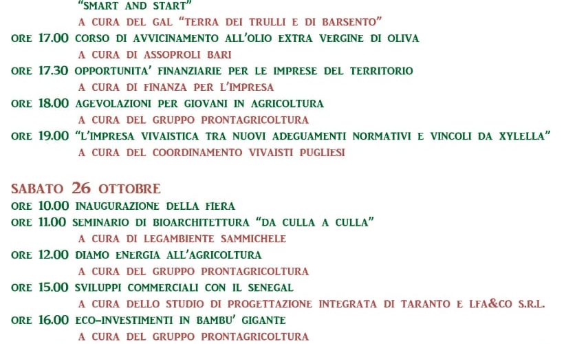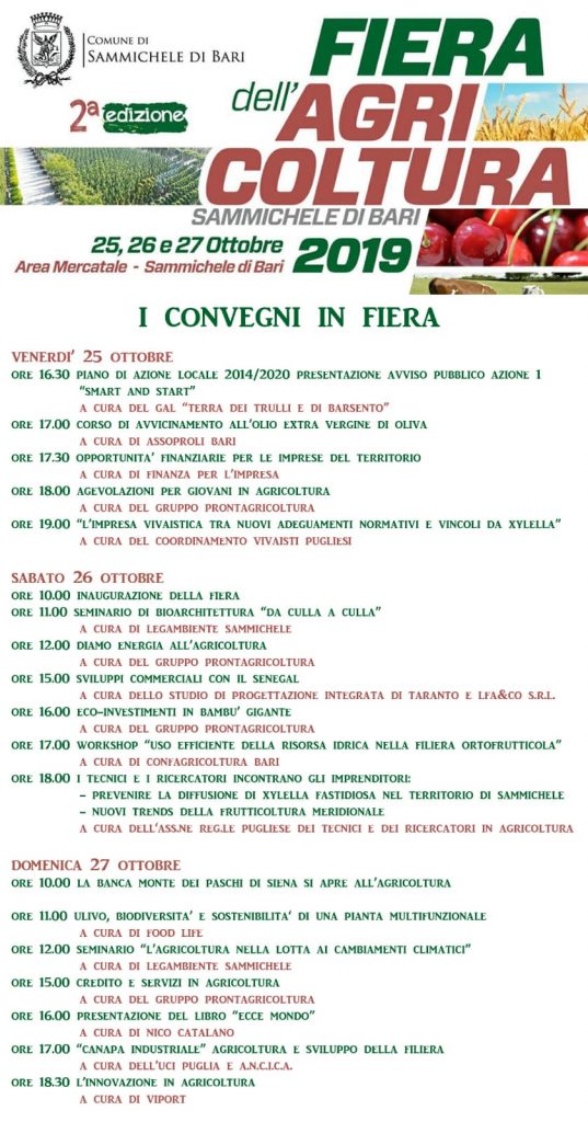 La Fiera sarà allestita in via Rossi nell’area mercatale, l’elenco provvisorio è di 100 tra aziende agricole, associazioni ed altri gruppi d’impresa che hanno aderito all’iniziativa fortemente voluta dall’Amministrazione Comunale ed in particolare dall’assessorato all’Agricoltura. Per tre giorni Sammichele diviene l’ombelico del mondo agricolo. Una full immersion per operatori del settore che esporranno i propri prodotti. Ormai, la cucina pugliese è diventata un brand d’eccellenza in ambito nazionale. Non va dimenticato che la cucina genuina trova le sue radici nell’agricoltura che resta ancora una delle voci importanti del PIL pugliese. Spazio, dunque, ai prodotti nostrani, dal settore lattiero-caseario alle macchine ed attrezzature agricole nonché dell’artigianato legato al comparto agricolo, al mondo dei vivai sino a tutto il vasto indotto di allevamenti bovini del territorio. La Fiera dell’Agricoltura sarà un momento importante per concludere affari e scambiare esperienze e progetti innovativi. Il sindaco Lorenzo Netti: “Il Comune punta a valorizzare un settore strategico per un intero territorio del sud-est barese ma sta tracciando anche realtà di altre regioni, l’obiettivo è creare un appuntamento annuale per valorizzare e presentare le eccellenze di questo Comune. Degna di nota è quest’anno la presenza della Repubblica del Senegal con una qualificata delegazione di produttori e rappresentanti istituzionali. Altamente interessante l’attività convegnistica prevista nelle tre giornate.