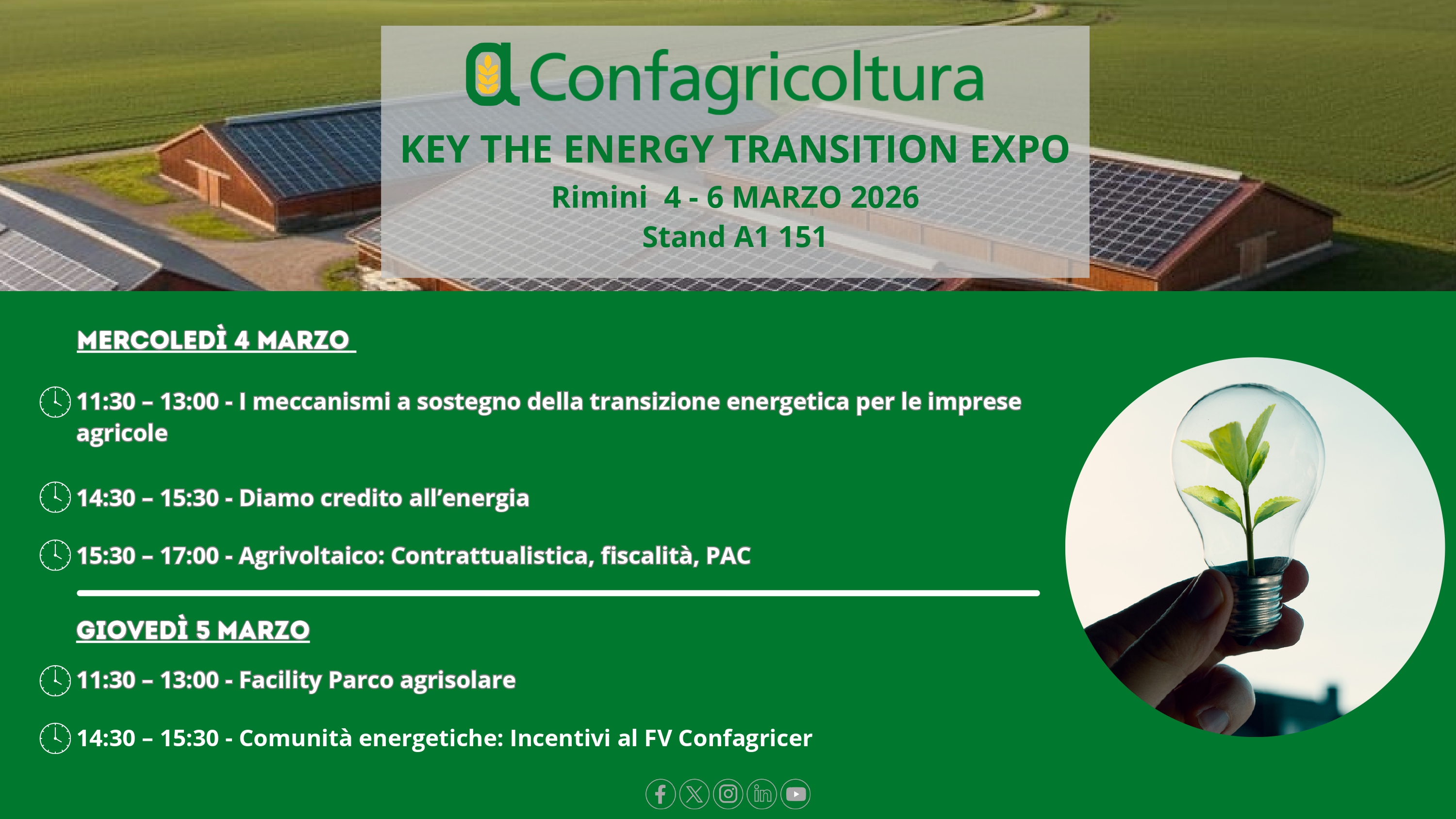Confagricoltura sarà presente con un proprio stand a KEY – The Energy Transition Expo, l’evento di riferimento per le tecnologie, i servizi e le soluzioni integrate per l’efficienza energetica e le energie rinnovabili in Italia e nel bacino del Mediterraneo. La manifestazione si terrà presso il quartiere fieristico di Rimini nei giorni 4, 5 e 6 marzo 2026.