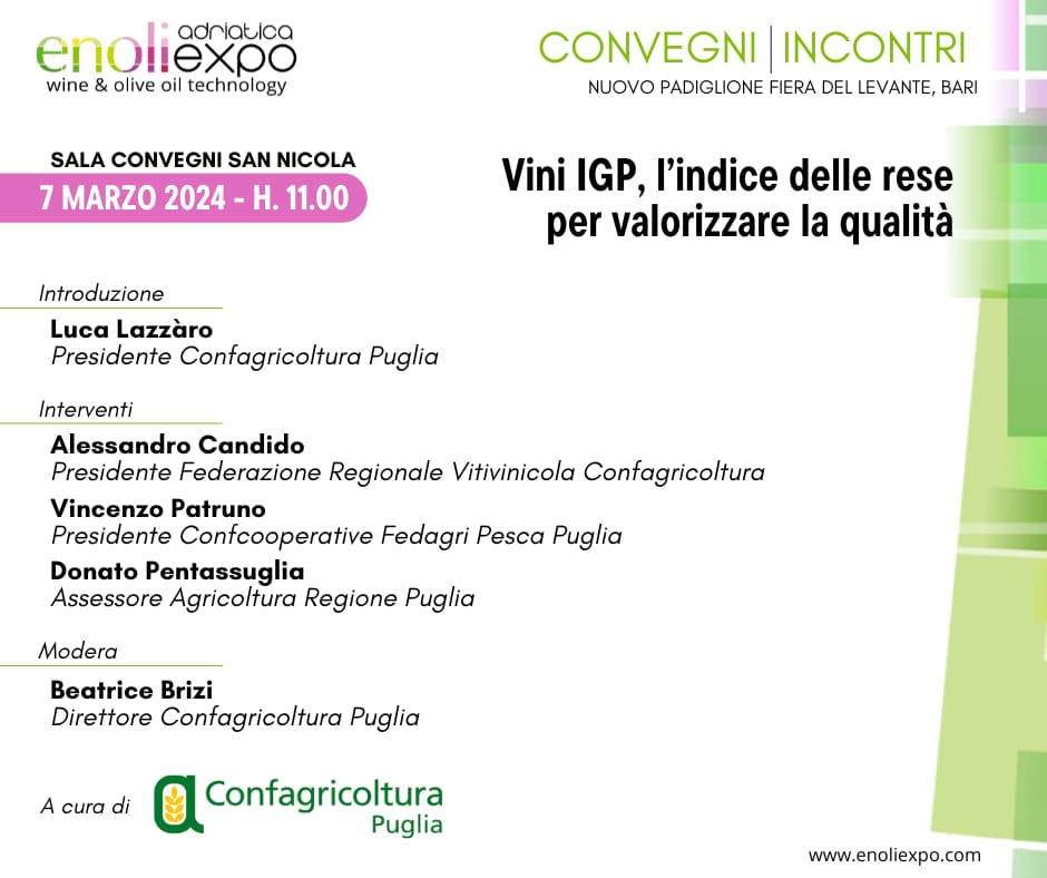 Giovedì prossimo 7 marzo, alle ore 11, nella sala San Nicola della Fiera del Levante a Bari, si terrà il convegno “Vini Igp, l’indice delle rese per valorizzare la qualità”.