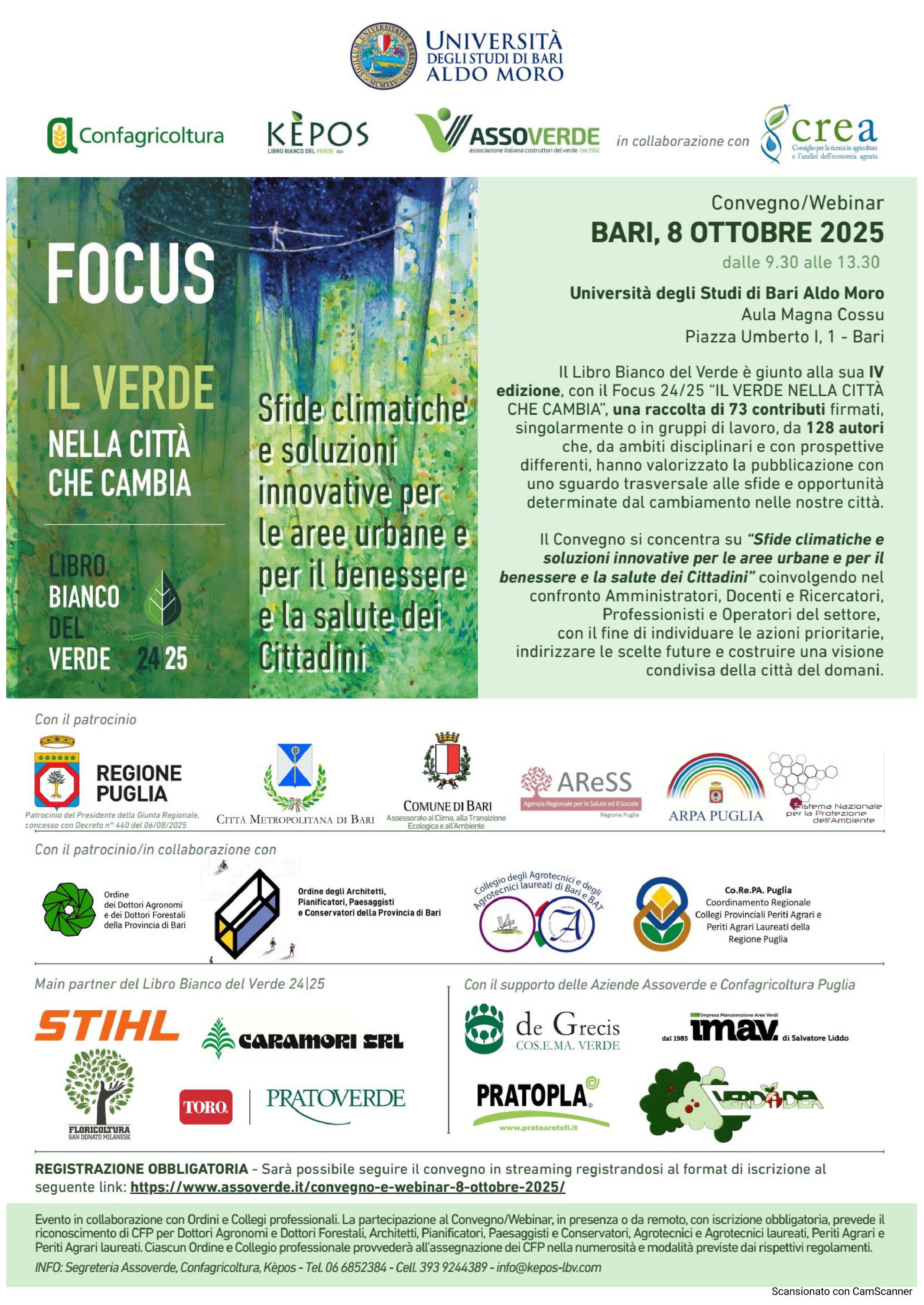 È l’obiettivo del convegno/webinar “Il verde nella città che cambia: sfide climatiche e soluzioni innovative per le aree urbane e per la salute e il benessere dei cittadini”, che si terrà a Bari mercoledì 8 ottobre 2025, dalle 9.30 alle 13.30, nell’Aula Magna Cossu dell’Università degli Studi di Bari Aldo Moro, Piazza Umberto I.