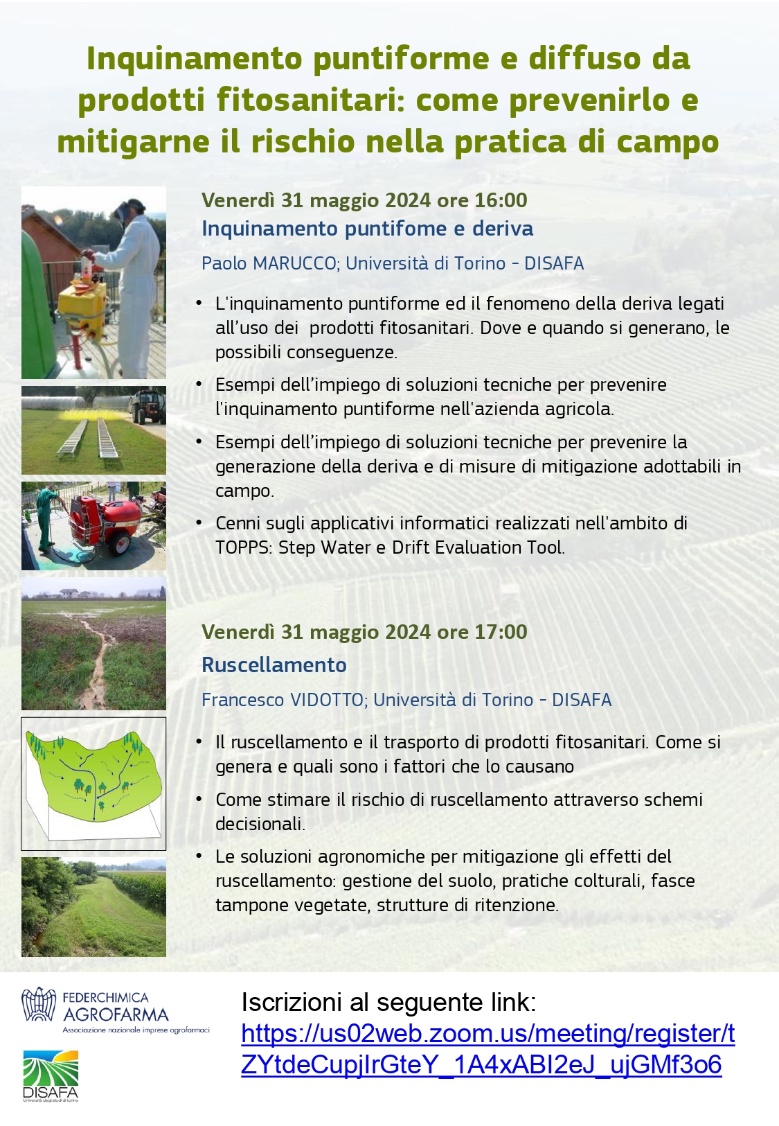 Si segnala che il 31 maggio alle ore 16:00 si terrà un corso di formazione, organizzato da Agrofarma, in cui verranno approfonditi i principali aspetti legati all’inquinamento puntiforme e diffuso da prodotti fitosanitari.