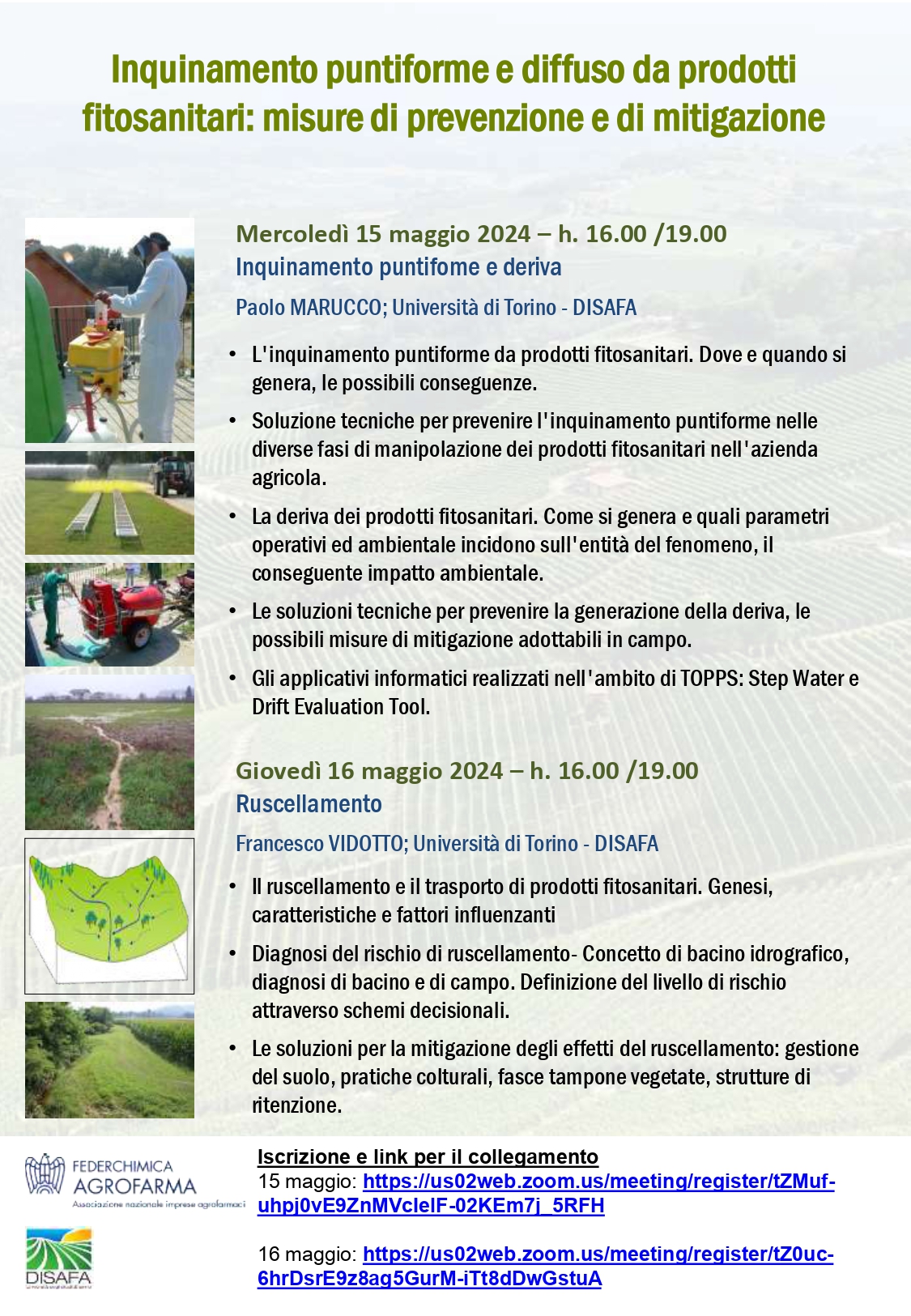 In particolare, la prima giornata (15 maggio, dalle 16:00 alle 19:00) sarà dedicata all’inquinamento puntiforme e deriva, mentre nella seconda giornata (16 maggio, dalle 16:00 alle 19:00) verranno affrontati gli aspetti legati al ruscellamento.
