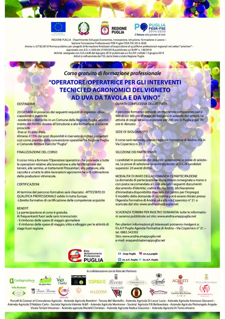 Enap Puglia, in collaborazione con Confagricoltura Bari-Bat e altri partner, organizza un corso gratuito di formazione per “Operatore/operatrica per gli interventi tecnici ed agronomi del vigneto ad uva da tavola e da vino”.
