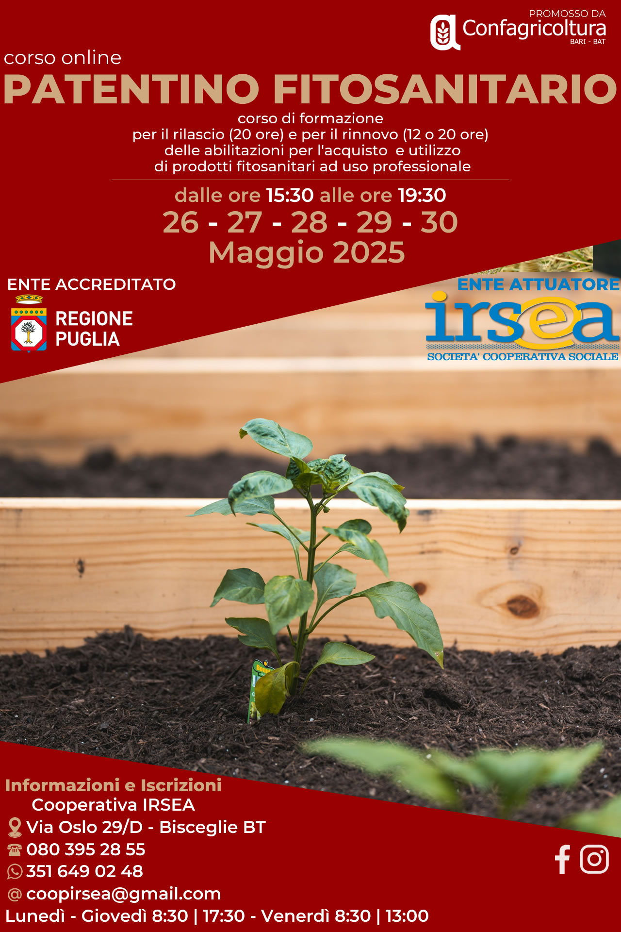 Gentilissimo, il corso in oggetto partirà il 26 maggio e si terrà in modalità online. Solitamente i corsi che organizziamo per ottenere il patentino fitosanitario non sono in presenza. Se interessato, per maggiori informazioni può chiamare al 349.3223733 o scrivere a: comunicazione@confagricolturabari.com
