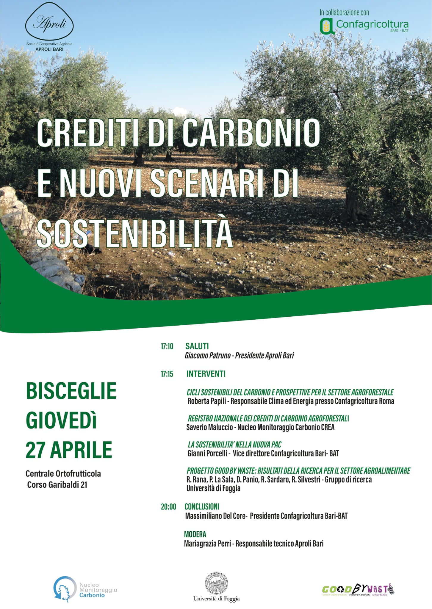 Giovedì 27 aprile alle ore 17.00 nella Centrale Ortofrutticola di Bisceglie, si terrà un importante convegno su “Crediti di carbonio e nuovi scenari di sostenibilità”, una nuova frontiera per il nostro sistema olivicolo.