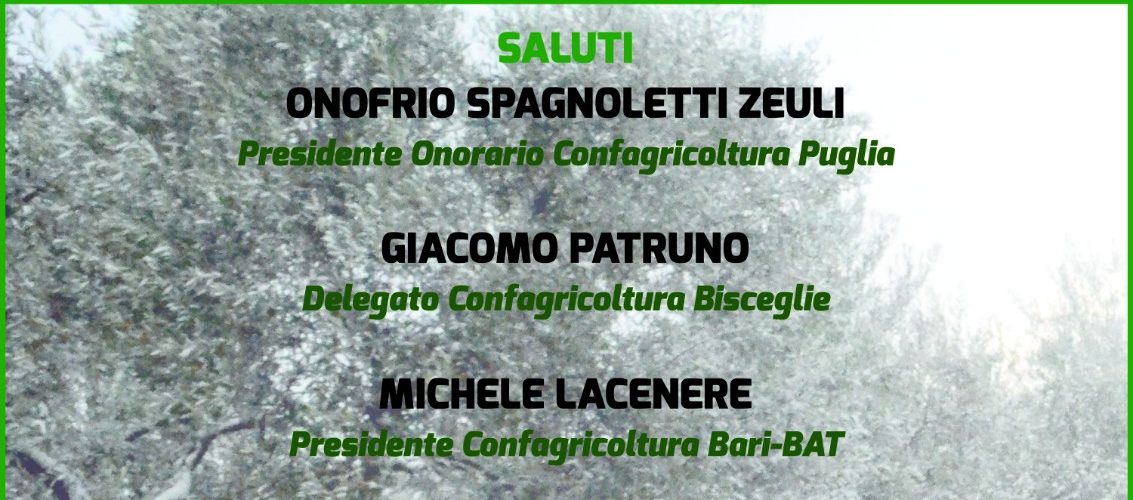 L’appuntamento è per venerdì 14 giugno alle ore 17.30 a Bisceglie, in corso Garibaldi 21 (centrale ortofrutticola). Interverranno il presidente onorario di Confagricoltura Puglia, Onofrio Spagnoletti Zeuli, il presidente di Confagricoltura Bari-Bat, Michele Lacenere, il vicedirettore di Confagricoltura Bari-Bat nonché direttore tecnico di Confagricoltura Puglia, Gianni Porcelli, e Giacomo Patruno, delegato Confagricoltura di Bisceglie.