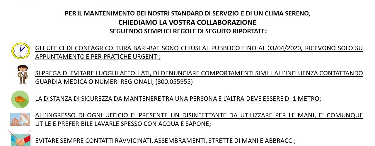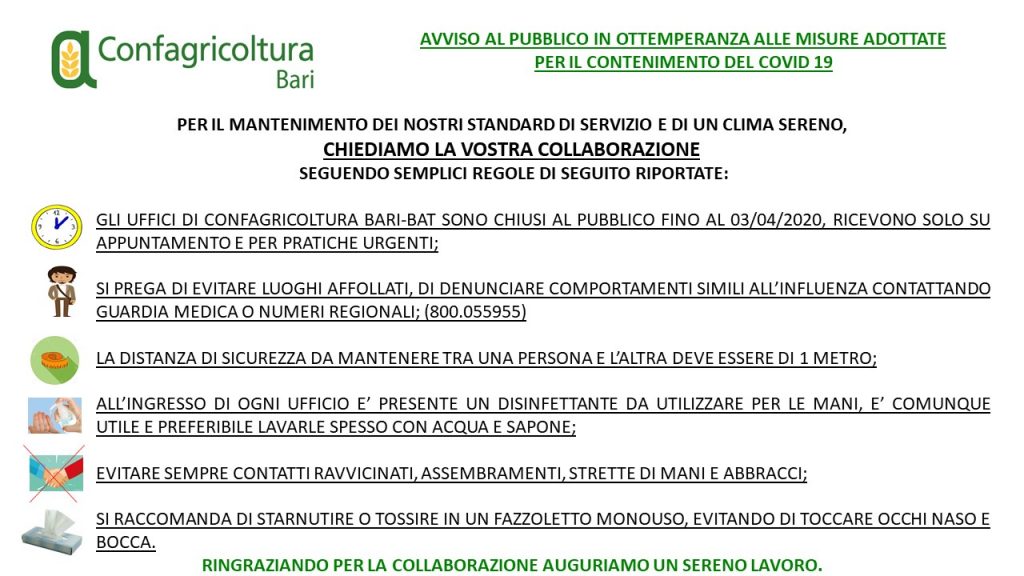 In ottemperanza al DPCM ministeriale per il contenimento dell’infezione provocata dal Coronavirus, si comunica che gli uffici di Confagricoltura Bari-Bat resteranno chiusi al pubblico fino al 03/04/2020, riceveranno solo su appuntamento e per pratiche urgenti.