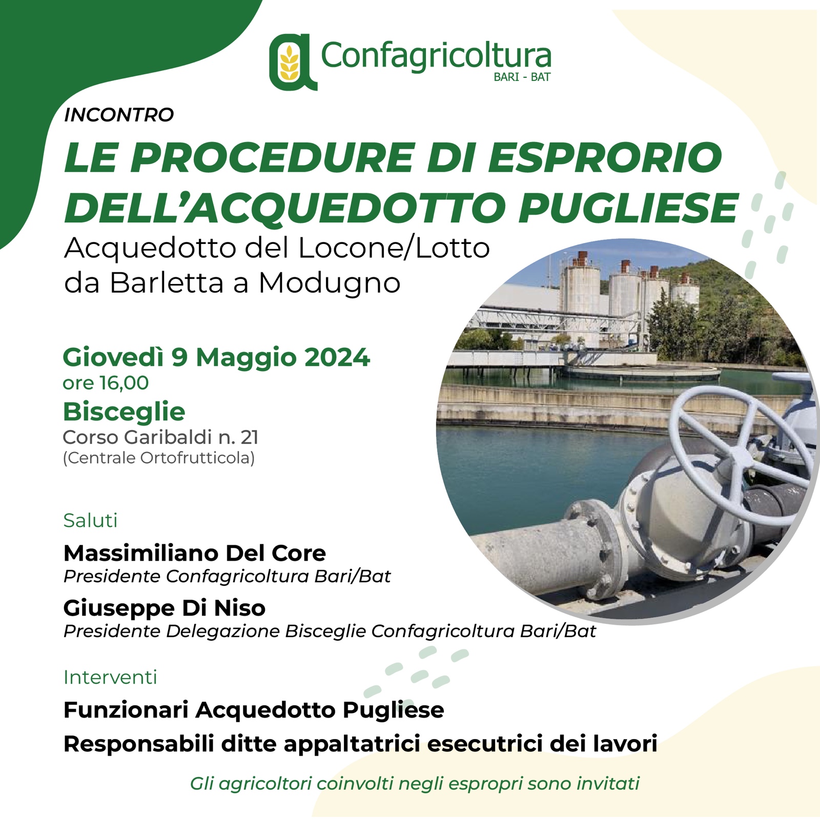 Giovedì 9 maggio alle ore 16.00 si terrà nella Centrale Ortofrutticola di Bisceglie, in via C.so Garibaldi 21, un incontro tra i responsabili dell’acquedotto pugliese e le ditte appaltatrici con gli agricoltori coinvolti dagli espropri.