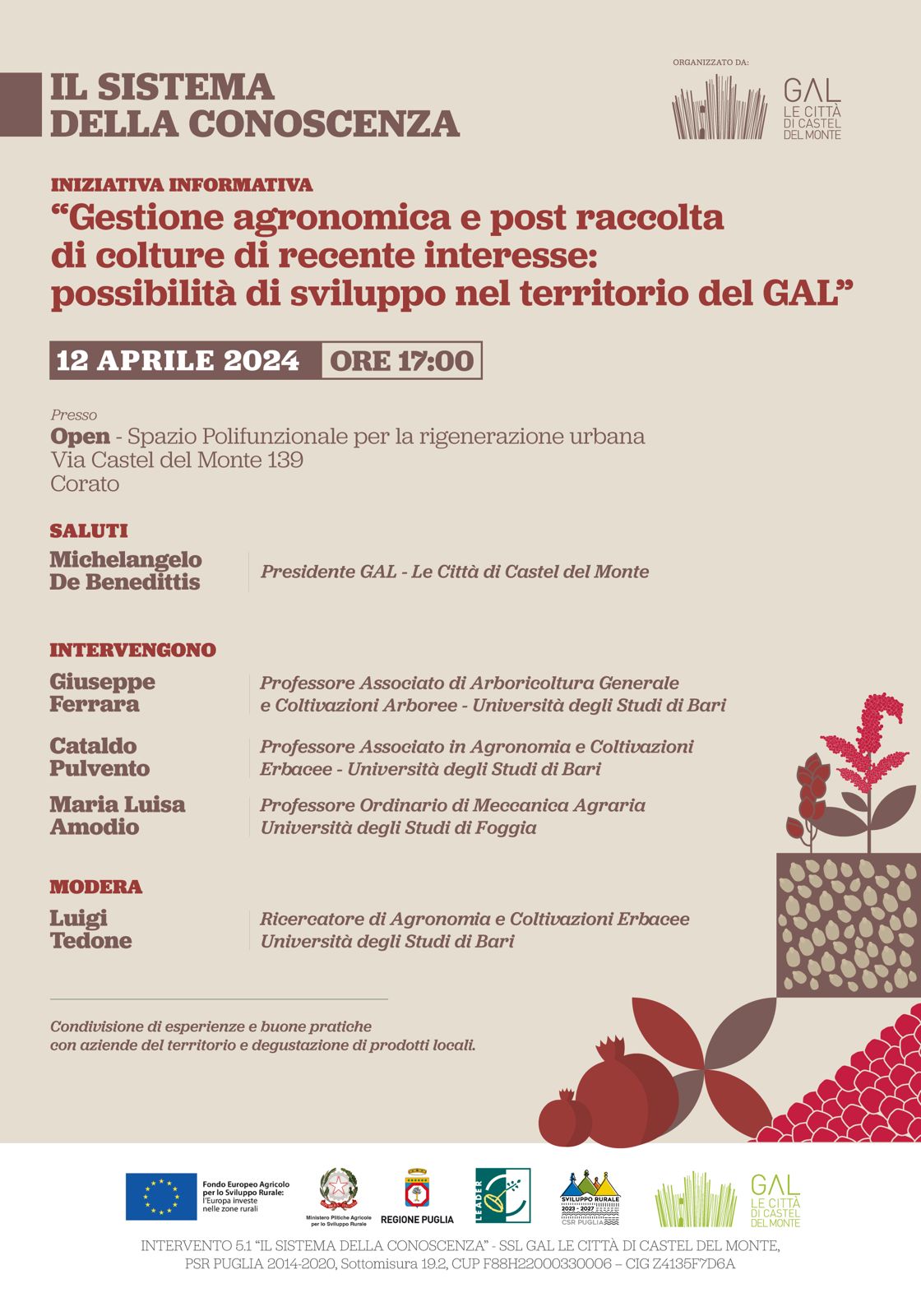 Questo incontro, che si terrà nello spazio Open, in via Castel del Monte 139 a Corato, si intitola “Gestione agronomica e post raccolta di colture di recente interesse: possibilità di sviluppo nel territorio del GAL” e si focalizzerà su produzioni alternative, quali ad esempio quinoa, grano saraceno, melograno, fico e amaranto.