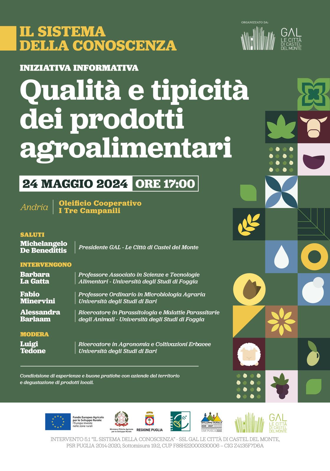Venerdì 24 maggio alle ore 17.00, nella sede dell’Oleificio Cooperativo I Tre Campanili di Andria, si terrà il prossimo incontro informativo organizzato dal GAL Le Città di Castel del Monte, di cui la nostra Organizzazione è socia, dedicato alla qualità e tipicità dei prodotti agroalimentari. .