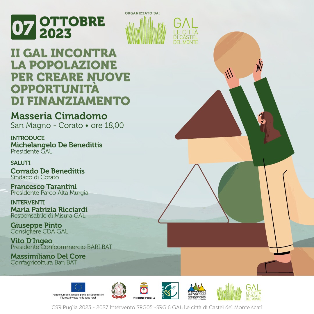 Sabato 7 ottobre alle ore 18:00, nella cornice del Festival della Ruralità del Parco dell’Alta Murgia, si terrà il quarto appuntamento del ciclo di incontri con il territorio di GAL le città di Castel del Monte presso Masseria Cimadomo, San Magno – Corato.