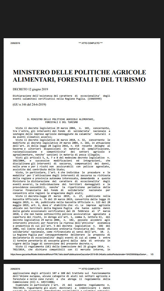 Il decreto “gelate 2018” è stato pubblicato in Gazzetta ufficiale il 24 giugno scorso. Ricordiamo ai soci che le istanze per i contributi vanno presentate entro e non oltre 45 giorni dalla pubblicazione. Gli uffici di Confagricoltura Bari-Bat sono a disposizione delle aziende per l’espletamento delle pratiche necessarie ad ottenere gli aiuti.
