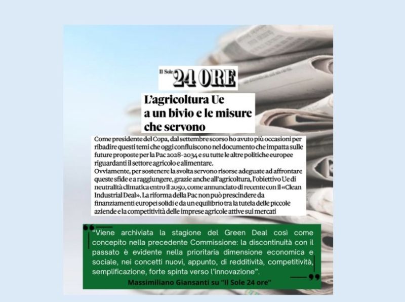 Giansanti sul Sole 24 Ore: “La nuova visione UE segna una svolta, ma servono risorse adeguate”
