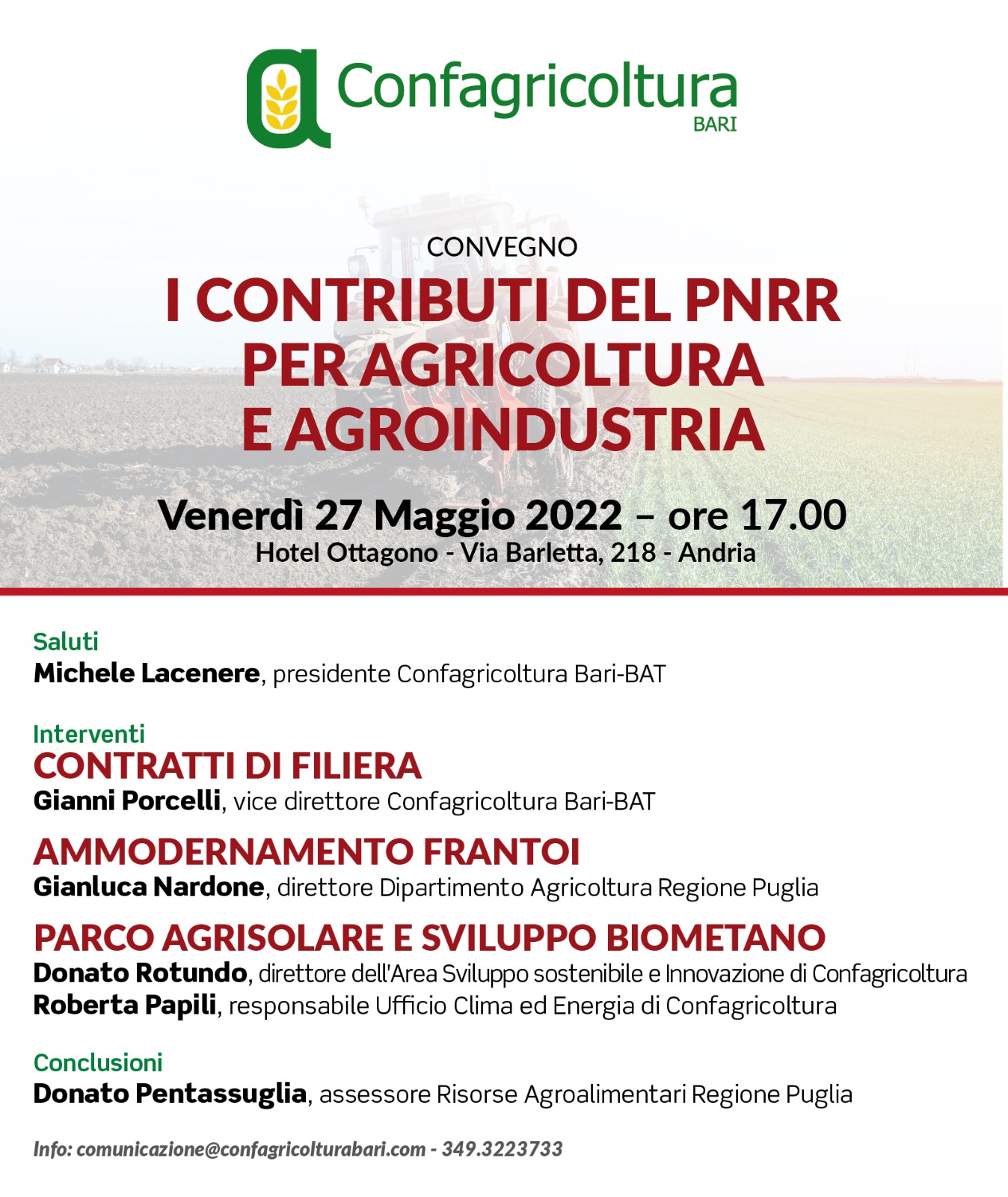 Si terrà venerdì 27 maggio, ad Andria, a partire dalle ore 17 nell’hotel Ottagono, in via Barletta 218, il convegno organizzato da Confagricoltura Bari-Bat su “I contributi del Pnrr per agricoltura e agroindustria”.