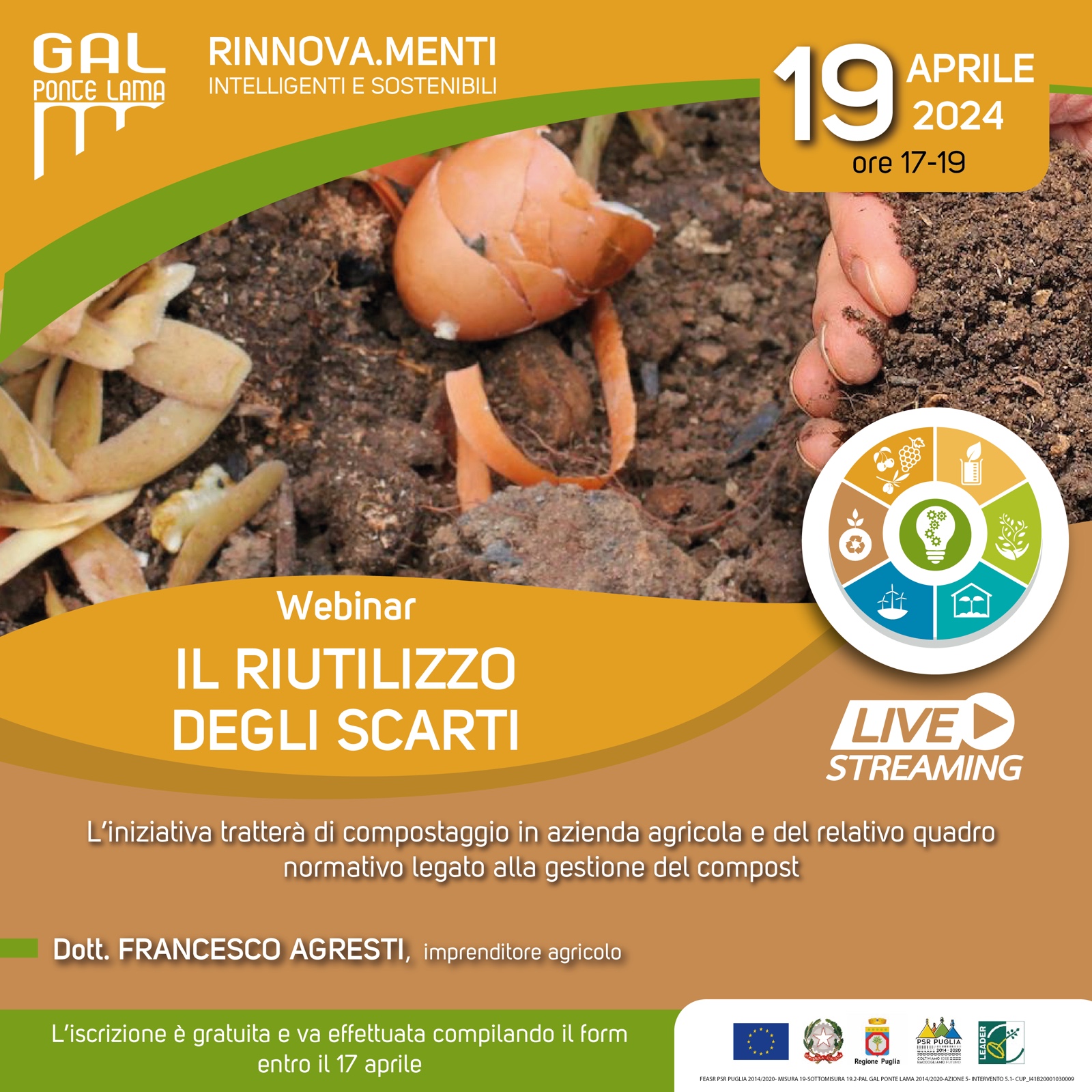 Venerdì 19 aprile ore 17.00 si terrà un webinar su “Il riutilizzo degli scarti” che si focalizzerà sul tema del compostaggio in azienda agricola e del relativo quadro normativo legato alla gestione del compost