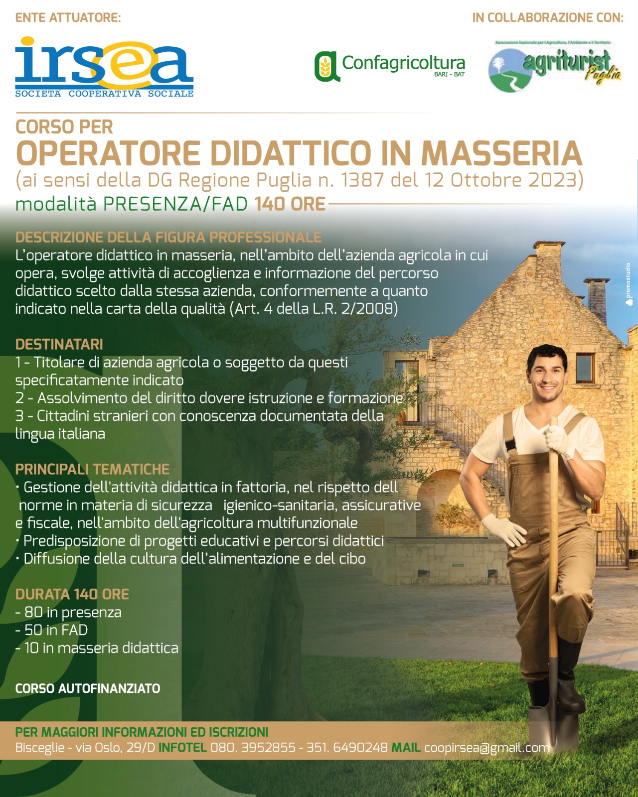 Dopo il successo della prima edizione riparte il nuovo corso per “Operatore didattico in masseria“, attuato da Irsea in collaborazione con la nostra Organizzazione e Agriturist Puglia, che permetterà ai partecipanti di ottenere il riconoscimento di “masseria didattica” e iscrizione nell’Albo Regionale di riferimento (ai sensi dell’art.7 L.R. n.2/2008).