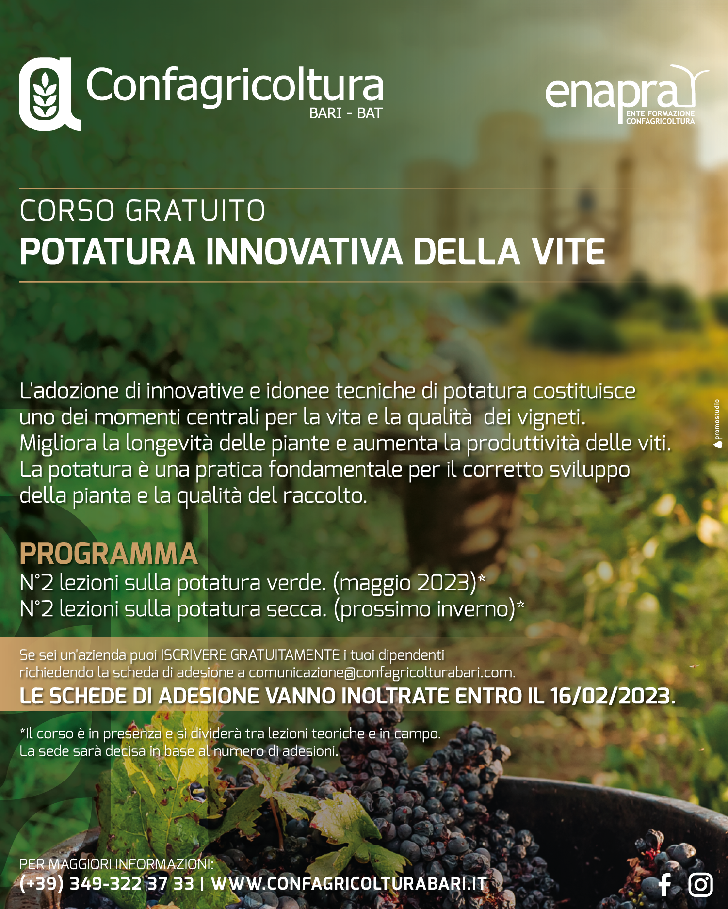 Se sei un’azienda vitivinicola puoi iscrivere gratuitamente i tuoi dipendenti richiedendo la scheda di adesione a comunicazione@confagricolturabari.com che va compilata e inoltrata allo stesso indirizzo email entro il 16 febbraio 2023.