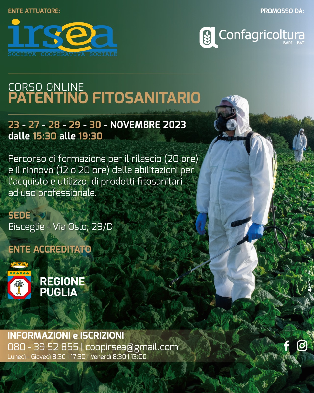 Partirà a breve un corso di formazione online per il rilascio o il rinnovo del “Patentino Fitosanitario” (D.P.R. 290/01) necessario per acquistare e impiegare prodotti fitosanitari (agrofarmaci o fitofarmaci) classificati come tossici, molto tossici e nocivi, in attuazione del D.M 22/01/2014 e DGR della Regione Puglia n.627/anno 2015.
