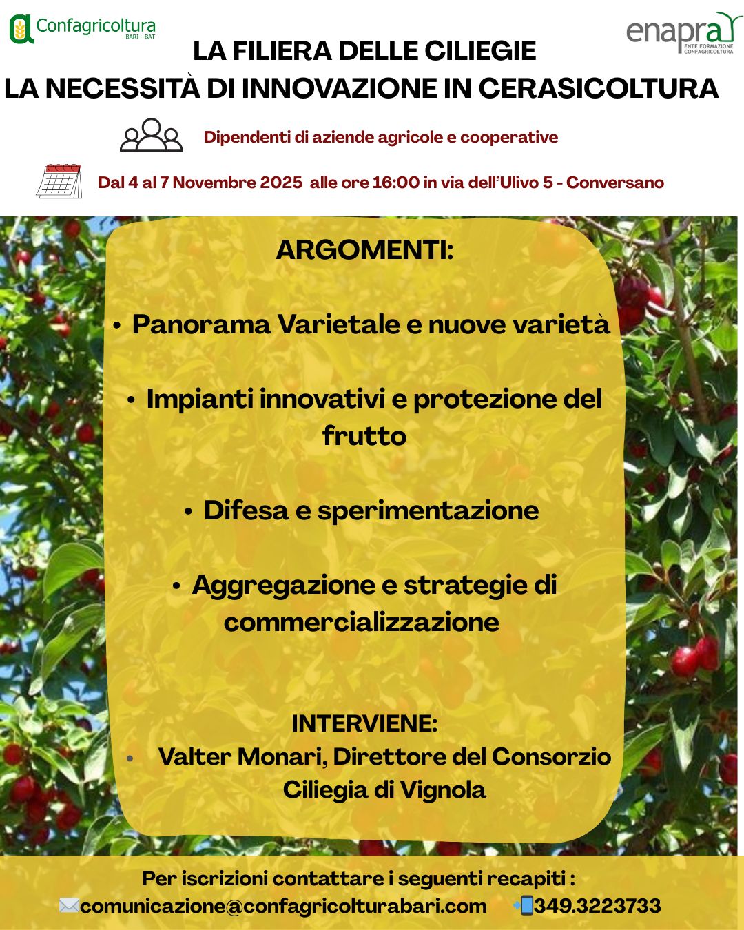 L’attività formativa partirà a novembre e si articolerà in quattro giornate a Conversano. Docente del corso sarà Valter Monari, direttore del Consorzio Ciliegia di Vignola.