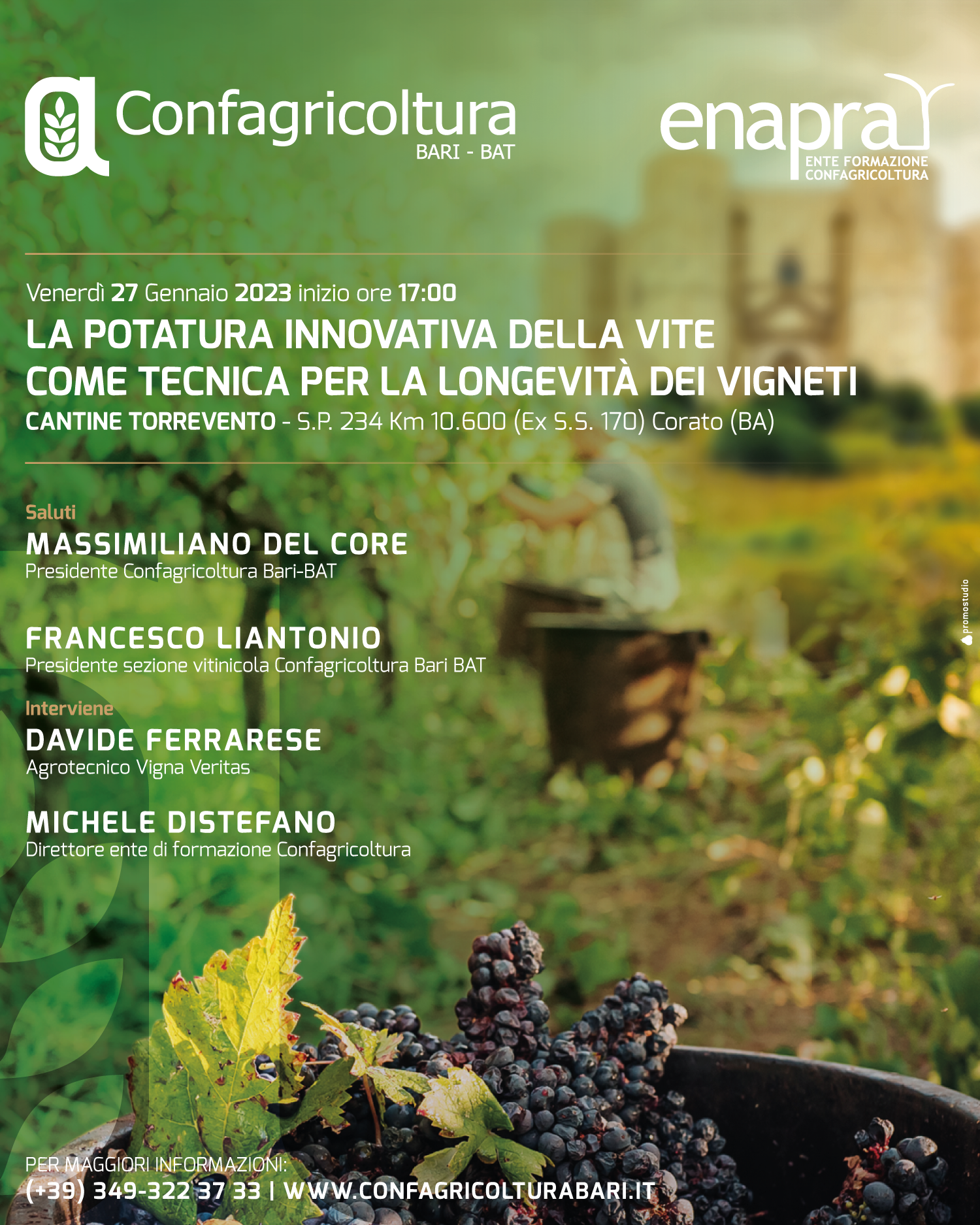 L’incontro tecnico si terrà venerdì 27 gennaio 2023 alle ore 17.00 alle Cantine Torrevento – S.P. 234 Km 10.600 (Ex S.S. 170) Corato (BA). Interverranno: Massimiliano Del Core, presidente Confagricoltura Bari-BAT; Francesco Liantonio, presidente sezione vitivinicola Confagricoltura Bari BAT; Davide Ferrarese, Agrotecnico Vigna Veritas; Michele Distefano, Direttore ente di formazione Confagricoltura.