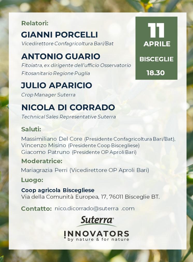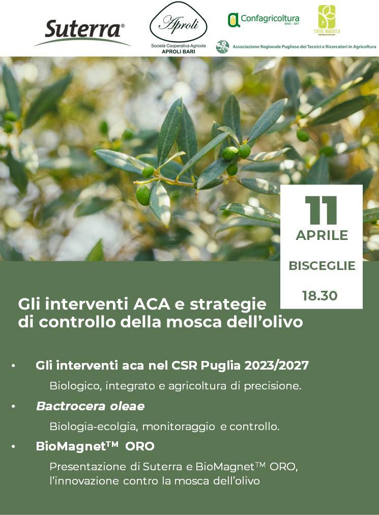 Giovedì 11 aprile, alle ore 18.30 presso Coop Agricola Biscegliese (Viale della Comunità Europea 17), si terrà un evento in collaborazione con Aproli e la cooperativa Torre Maestra per discutere degli interventi ACA e delle strategie di controllo della mosca dell’olivo.
