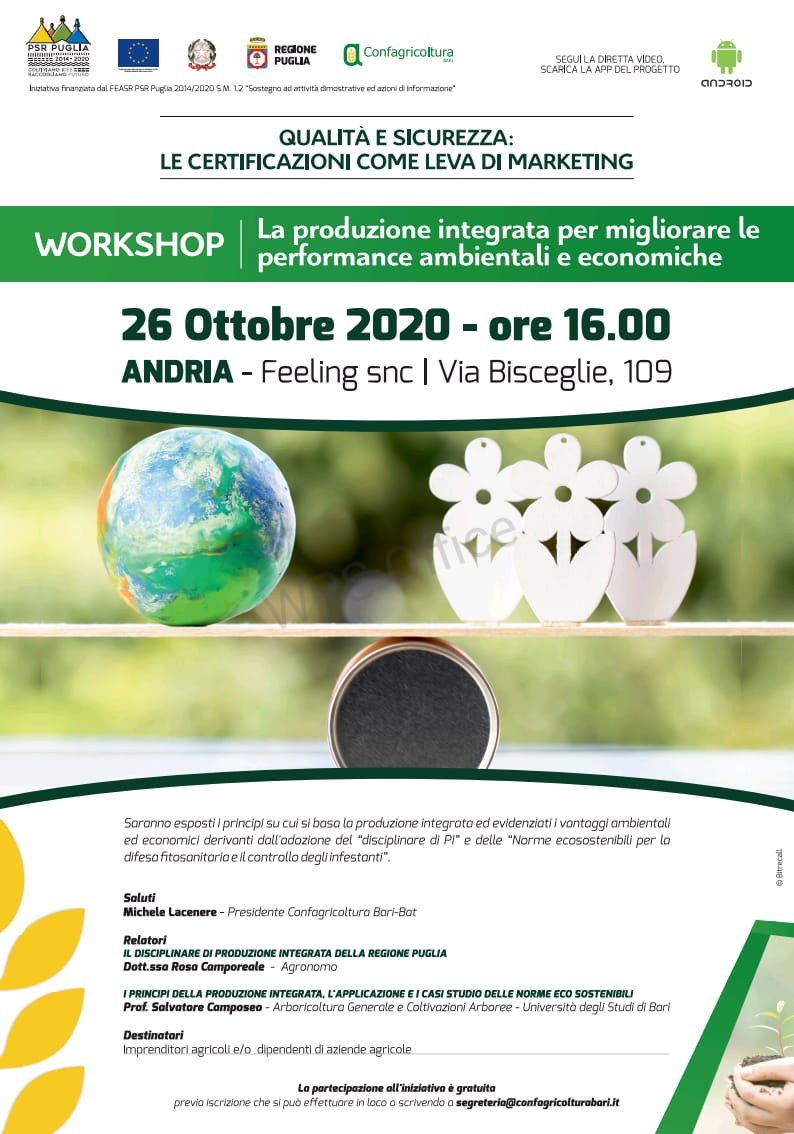 Nel rispetto delle prescrizioni del Dpcm, si svolgerà solo online anche il quarto appuntamento dei workshop di Confagricoltura Bari-Bat sul tema “Qualità e sicurezza, le certificazioni come leva di marketing”, organizzati attraverso i finanziamenti della misura 1.2 del Psr Puglia 2014/2020. Lunedì 26 ottobre, ad Andria, è in programma l’evento dal titolo “La produzione integrata per migliorare le performance ambientali ed economiche”. Questo il link per seguire l’evento: https://meet.google.com/sei-qjys-hrf