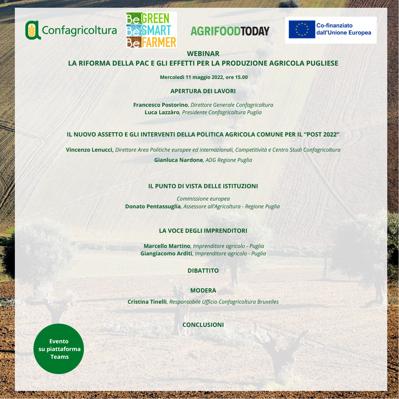 “La riforma della PAC e gli effetti per la produzione agricola pugliese” è il webinar organizzato da Confagricoltura e Confagricoltura Puglia con la partecipazione di importanti esponenti delle Istituzioni europee, nazionali e regionali. Il webinar è fissato per mercoledì 11 maggio 2022 alle ore 15. Per partecipare è necessario registrarsi e compilare, entro il giorno martedì 10 maggio 2022 ore 13:30, la scheda riportata al seguente link: