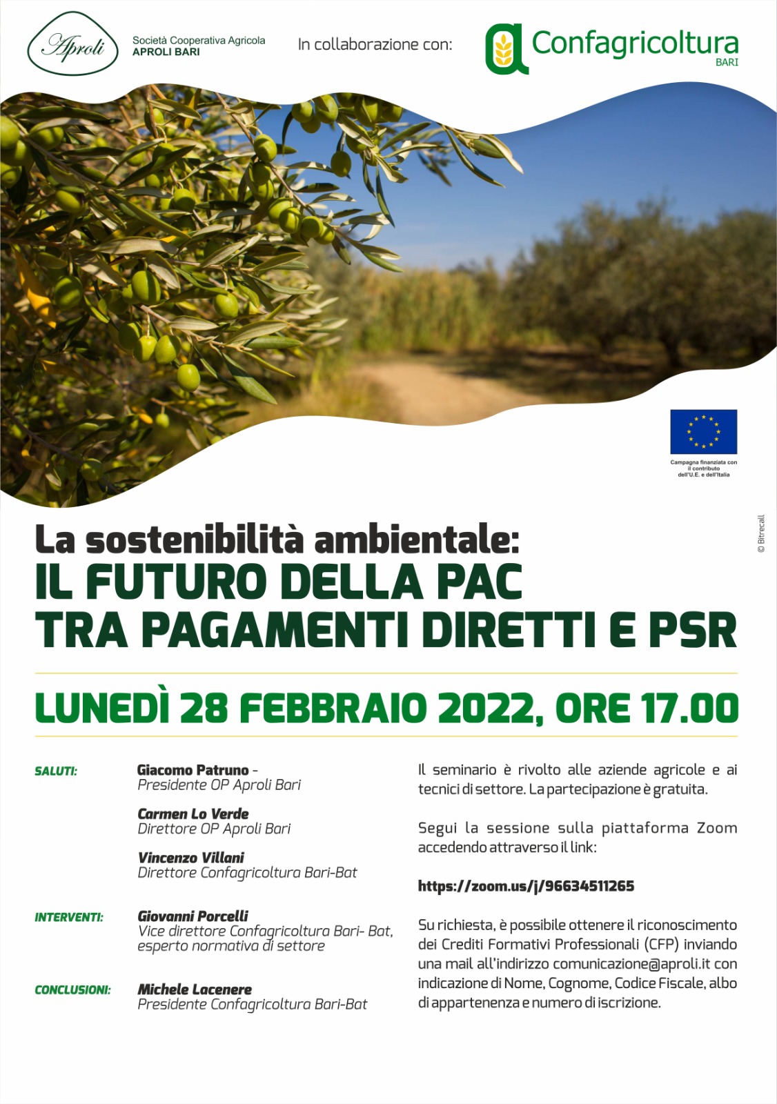 Aproli, O.P. olivicola di Puglia, in collaborazione con Confagricoltura Bari-Bat, organizza il webinar dal titolo “La sostenibilità ambientale: il futuro della PAC tra pagamenti diretti e PSR” che si terrà il 28 febbraio su piattaforma Zoom.