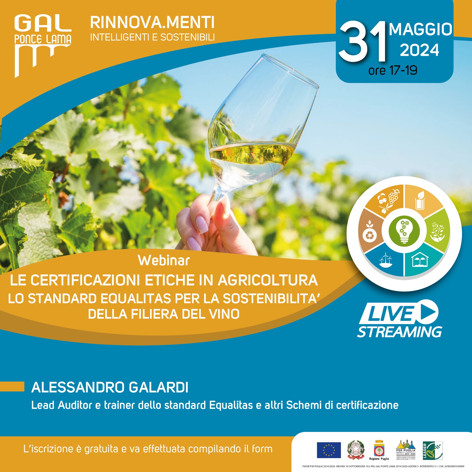 Venerdì 31 maggio alle ore 17.00 prossimo webinar del GAL Ponte Lama, di cui la nostra Organizzazione è socia, su “Le certificazioni etiche in agricoltura”.