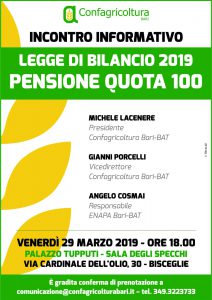 Cosa cambia per le aziende agricole e per tutti i cittadini con le novità inserite nella legge di Bilancio 2019 e l’introduzione del provvedimento “Quota 100”? Per rispondere alla domanda e chiarire ogni aspetto normativo, Confagricoltura Bari-Bat ha organizzato un incontro formativo: l’appuntamento è venerdì 29 marzo, alle ore 18, nella sala degli Specchi di Palazzo Tupputi, in via Cardinale dell’Olio, 30, a Bisceglie.