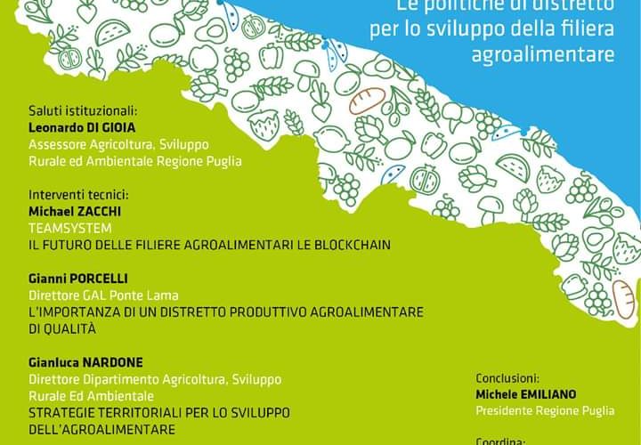 I saluti istituzionali saranno affidati all’Assessore all’Agricoltura e allo Sviluppo Rurale, Leonardo di Gioia. Gli interventi tecnici saranno realizzati, invece, da Michael Zacchi di Teamsystem, che descriverà le tematica relativa al futuro delle filiere produttive e le blockchain, da Gianni Porcelli, Direttore del GAL Ponte Lama, che approfondirà l’importanza di un Distretto produttivo agroalimentare di qualità, da Gianluca Nardone, Direttore del Dipartimento Agricoltura, Sviluppo Rurale e Ambiente, che delineerà le strategie pugliesi per lo sviluppo dell’agroalimentare, mentre l’approfondimento delle politiche di Distretto a livello nazionale sarà affrontato al Responsabile per le Politiche di Distretto del MIPAAFT, Alessandro Apolito. Le conclusioni spetteranno al Presidente della Regione Puglia, Michele Emiliano, mentre a coordinare l’incontro ci sarà Onofrio Giuliano, Presidente del GAL Tavoliere.