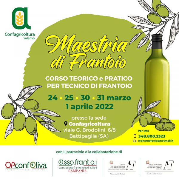Confagricoltura Salerno propone il I° Corso teorico–pratico per Tecnico di Frantoio: “Maestrìa di Frantoio”. L’idea nasce con lo scopo di metter in relazione le maestranze operative della produzione e della trasformazione con alcuni dei massimi esperti a livello internazionale del settore, per aiutare le imprese a produrre qualità ai massimi livelli attraverso una particolare attenzione alla valorizzazione del complesso patrimonio varietale provinciale e nazionale.