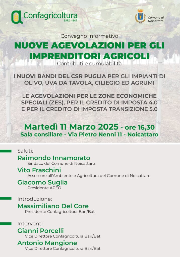 Martedì 11 marzo alle ore 16:30, nella Sala Consiliare di Noicattaro (Via Pietro Nenni, 11), si terrà un importante convegno dedicato al bando CSR Puglia che finanzia nuovi impianti di olivo, uva da tavola, ciliegio e agrumi.